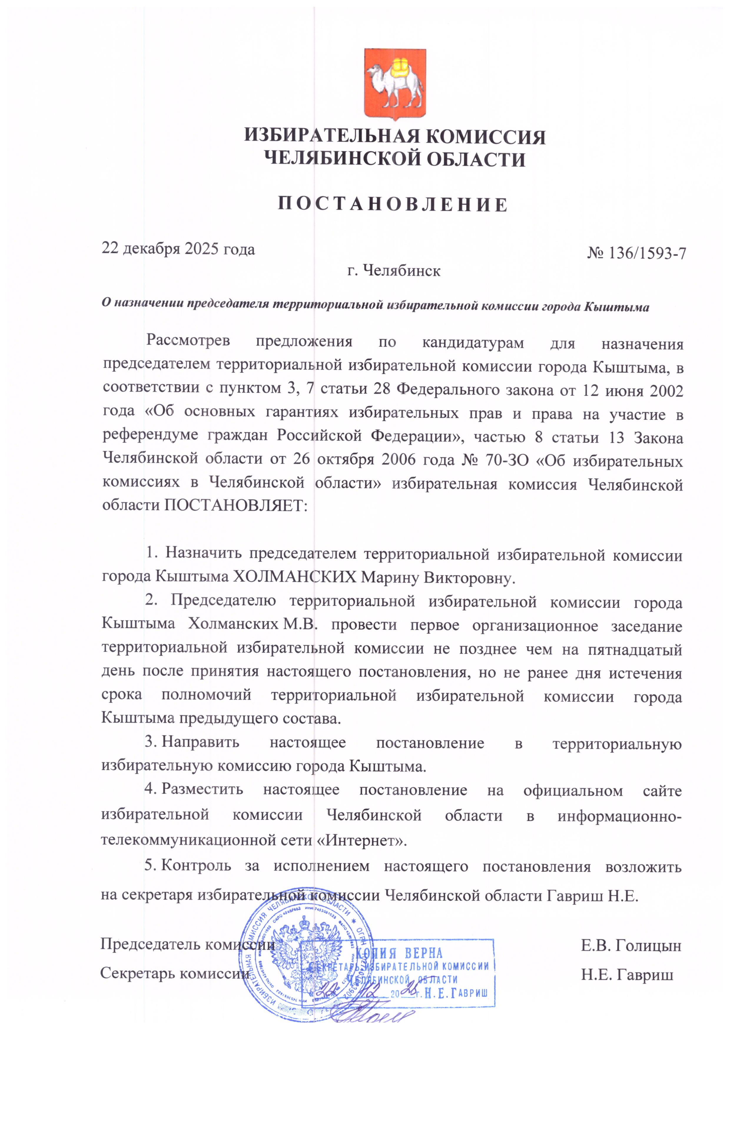 Постановление Избирательной комиссии Челябинской области от 22.12.2025 г. N 136/1593-7 "О назначении председателя территориальной избирательной комиссии города Кыштыма"